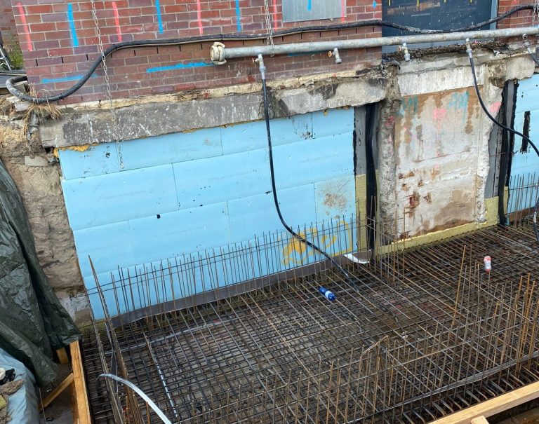Erarbeitung eines Abdichtungskonzeptes mit kunststoffmodifizierter Bitumendickbeschichtung (KMB) für den äußeren Sockelbereich. Bauüberwachung und fachliche Begleitung der Umsetzung.